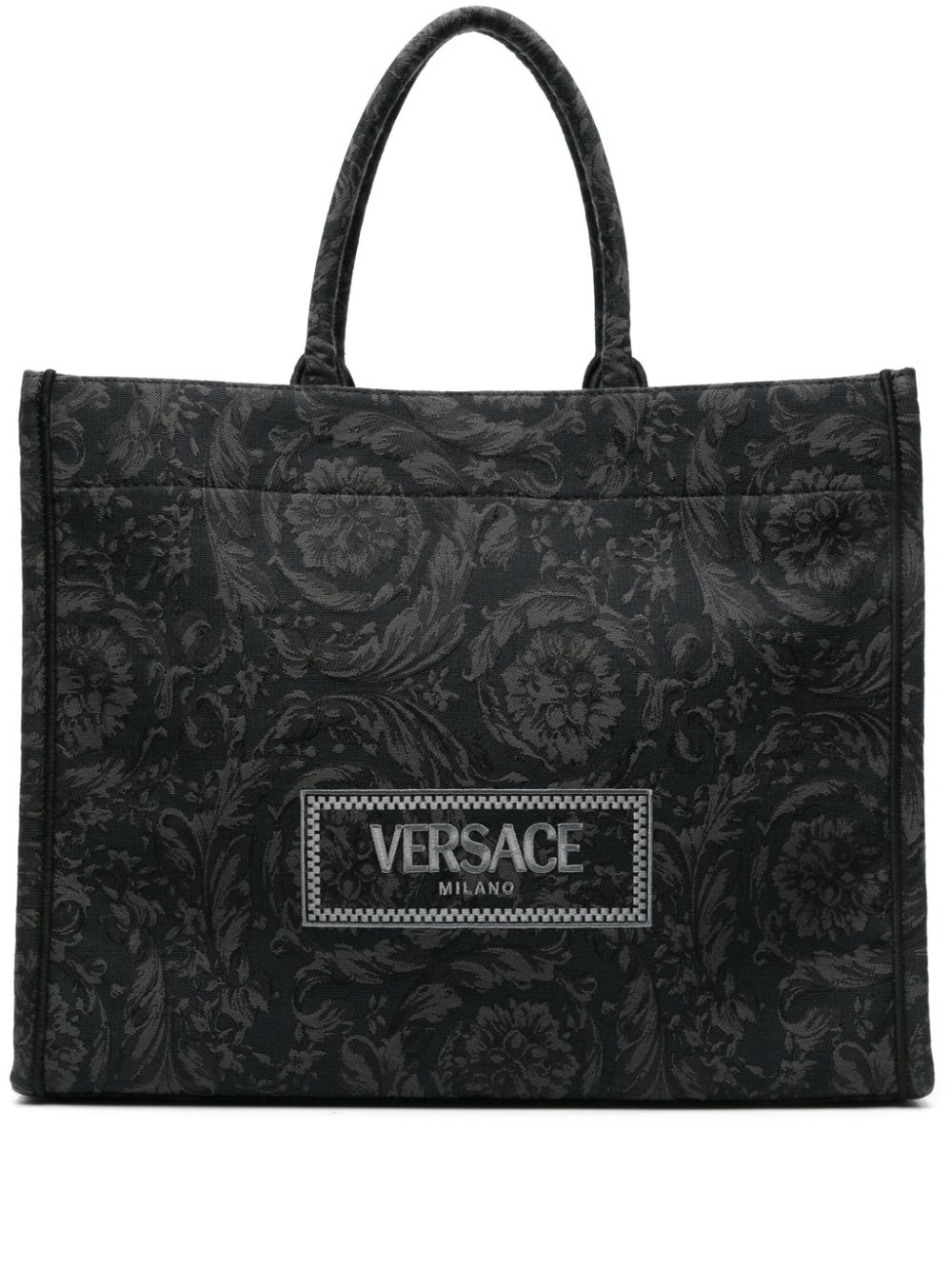 Barocco Athena jacquard canvas tote bag Highlights - Jet black - Cotton canvas - Signature barocco jacquard - Embroidered logo to the front - Open top - Two rolled top handles - Main compartment - Internal logo patch - Internal zip-fastening pocket - Gold-tone hardware Made in Italy Composition Outer: Calf Leather 100%, Polyamide 53%, Cotton 38%, Polyester 6%, Acrylic 3% SIZE & FIT Model measurements Height 6 ft 1 in(1.86 m) Bust/Chest 37.4 in(95 cm) Hips 36.22 in(92 cm) Waist 29.52 in(75 cm) Measurement DEPTH 6.69 in(17 cm) HANDLE 7.87 in(20 cm) HEIGHT 13.77 in(35 cm)