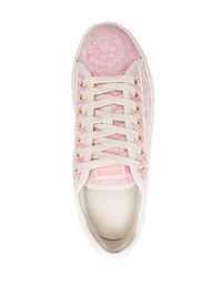 Barocco Greca sneakers Some of Versace’s most iconic house codes remain as relevant as when they were first introduced by the eponymous founder in the ‘90s – most notably its Barocco and Greca motifs. Swirling baroque flora is woven across the canvas uppers of these pink sneakers while the meandering pattern is embossed along the contrasting sole. Highlights - Light pink - Bubblegum pink - Patterned jacquard - Signature embossed greca detailing - Logo patch at the tongue - Leather piping detail - Branded heel counter - Gold-tone hardware - Round toe - Front lace-up fastening - Branded leather insole - Contrasting rubber sole Made in Italy Composition Outer: Fabric 100% Lining: Calf Leather 100% Sole: Rubber 100% SIZE & FIT Measurement HEEL 1.18 in(3 cm) Sole height 0.98 in(2.5 cm)