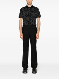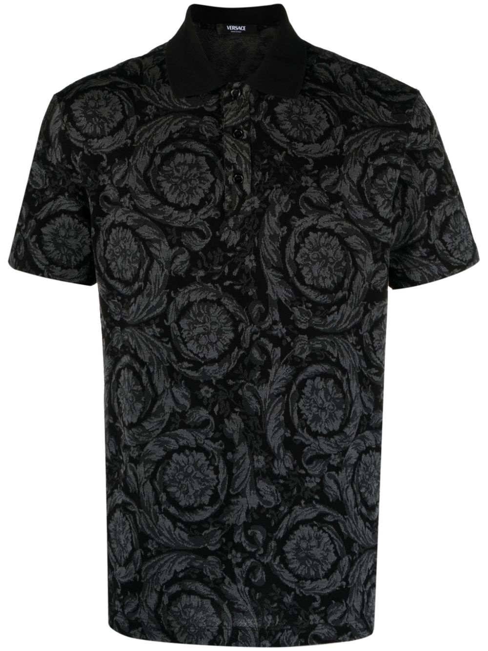 Barocco polo shirt This polo shirt is instantly recognisable with Versace's iconic Barocco pattern, reimagined for SS24 and presented in a deep-grey hue. It's crafted in Italy from pure cotton and features a short polo collar. Highlights - Medium grey - Cotton - Pique weave - Signature barocco jacquard - Ribbed polo collar - Front button placket - Short sleeves - Straight hem Made in Italy Composition Cotton 100% SIZE & FIT Model measurements Height 6 ft 1 in(1.86 m) Bust/Chest 37.4 in(95 cm) Hips 36.22 in(92 cm) Waist 29.52 in(75 cm) Measurement CHEST 42 in(106.7 cm) SLEEVE LENGTH 8.5 in(21.6 cm) FittingInformation Designed for a regular fit, this polo shirt offers a comfortable loose fit throughout the body Made from a midweight non-stretch fabric, this piece offers minimal elasticity when worn This piece fits true to size – take your usual size Washing instructions Hand Wash
