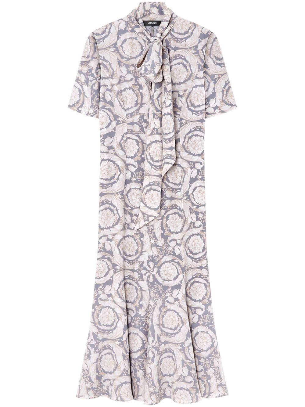 Barocco Lavalliere silk midi dress Highlights - Blue-grey/cream white - Silk - Signature barocco print - Scarf detailing - Keyhole neck - Concealed rear zip fastening - Short sleeves - Fitted waistline - Mid-length - Straight hem Made in Italy Composition Outer: Silk 100% Lining: Acetate 75%, Silk 25%