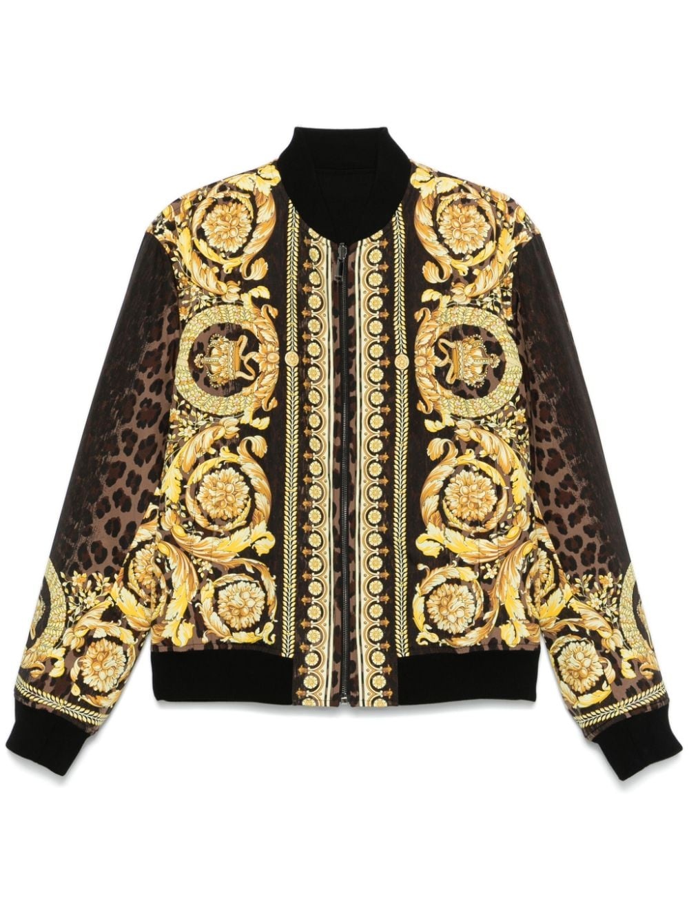 Barocco-print bomber jacket Highlights - Black/multicolour - Signature barocco print - Animal print - Front zip fastening - Baseball collar - Long sleeves - Ribbed cuffs and hem - Two press-stud fastening side pockets - Full lining - Straight hem Made in Italy Composition Outer: Virgin Wool 100%, Polyester 100%, Viscose 100% Lining: Cotton 100% SIZE & FIT Model measurements Height 6 ft 2 in(1.88 m) Bust/Chest 36.61 in(93 cm) Hips 35.82 in(91 cm) Waist 27.95 in(71 cm) FittingInformation Designed for a regular fit, allowing for a comfortably loose fit throughout the body The ribbed hem offers a close, comfortable fit Made from a midweight non-stretch fabric