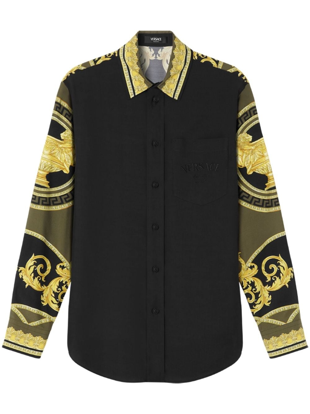 La Coupe des Dieux shirt Highlights - Black/multicolour - Panelled design - Signature barocco print - Classic collar - Front button fastening - Long sleeves - Buttoned cuffs - Curved hem Made in Italy Composition FSC Viscose 100%, Polyester 100%