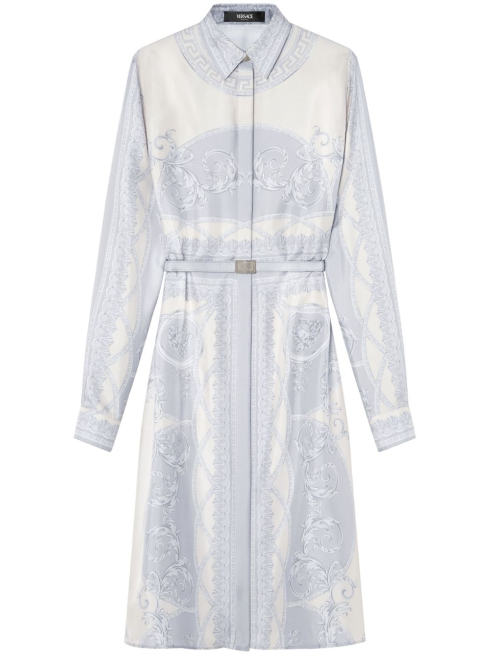 La Coupe des Dieux midi shirt dress Highlights - Light blue - Silk - Front button fastening - Spread collar - Long sleeves - Signature barocco print - Belted waist - Buttoned cuffs - Two side slit pockets - Straight hem - Mid-length Made in Italy Composition Silk 100%