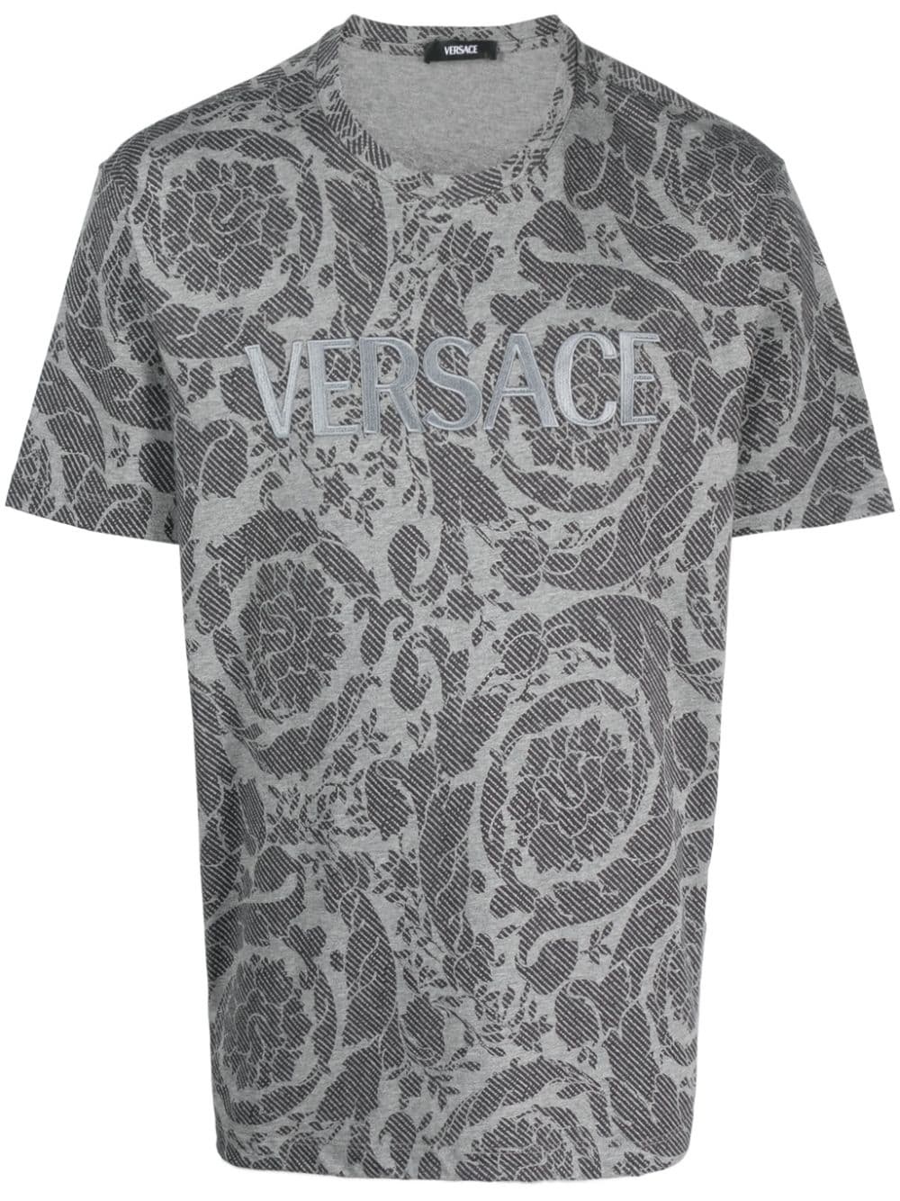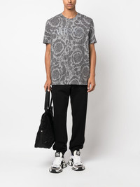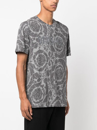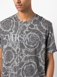 Barocco Silhouette T-shirt Versace brings its branding to the classic regular T-shirt. Crafted from cotton, it's detailed with a logo-print on top of the Barocco Silhouette printed background. Highlights - Medium grey - Cotton - All-over barocco silhouette print - Logo print at the chest - Crew neck - Short sleeves - Straight hem Imported Composition Polyester 100%, Cotton 100% SIZE & FIT Model measurements Height 6 ft 2 in(1.87 m) Bust/Chest 38.18 in(97 cm) Hips 36.61 in(93 cm) Waist 29.13 in(74 cm) FittingInformation Designed for a relaxed fit, this piece allows for comfort and movement when worn Made from a midweight non-stretch fabric, this piece offers minimal elasticity when worn This piece fits true to size – take your usual size Washing instructions Machine Wash