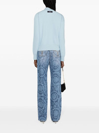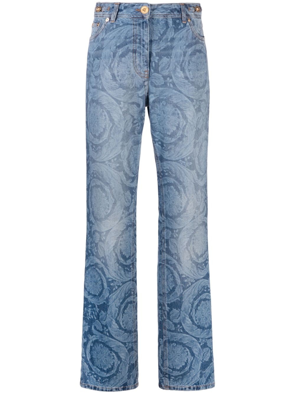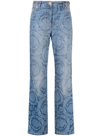 Barocco straight-leg jeans These straight-leg jeans are an ode to Versace’s foundational ‘90s era. Both the lasered Barocco pattern and Medusa ’95 hardware hail from its emerging years. Highlights - Blue - Cotton - Washed denim - Signature barocco print - Medusa plaque detail - Logo patch to the rear - Mid-rise - Belt loops - Straight leg - Concealed fly and button fastening - Classic five pockets Made in Italy Composition Lining: Polyester 65%, Cotton 35% Outer: Calf Leather 100%, Cotton 100% SIZE & FIT Model measurements Height 5 ft 11 in(1.8 m) Bust/Chest 34.25 in(87 cm) Hips 35.82 in(91 cm) Waist 24.8 in(63 cm) Measurement FRONT RISE 10.98 in(27.9 cm) INSIDE LEG 35 in(88.9 cm) BACK RISE 12.99 in(33 cm) HIPS 40 in(101.6 cm) Hem Width 15.98 in(40.6 cm) WAIST 32 in(81.3 cm) FittingInformation Designed for a straight-leg fit, these jeans allow for a close fit at the waist and an unrestricted and comfortable fit over the leg Sturdy and hard-wearing, this denim piece offers no stretch This piece fits true to size – take your usual size Washing instructions Machine Wash