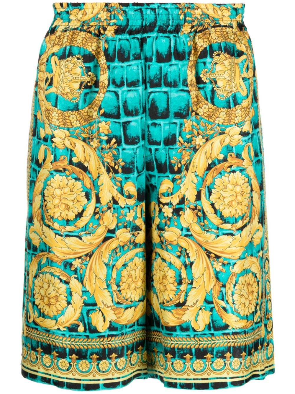 Baroccodile-print silk shorts Versace's opulence is embodied in these silk shorts from the AW23 collection. Featuring an elasticated waistband, they blend the signature Barocco print with a seasonal crocodile pattern, adding a dramatic flair to the relaxed silhouette. Highlights - Black/multicolour - Silk - Signature barocco print - Elasticated waistband - Two side slit pockets - Rear welt pocket - Straight leg - Knee-length Made in Italy Composition Lining: Cupro 100% Outer: Silk 100% SIZE & FIT Model measurements Height 6 ft 2 in(1.88 m) Bust/Chest 37.79 in(96 cm) Hips 35.82 in(91 cm) Waist 29.92 in(76 cm) FittingInformation Designed with a wide leg, offering a loose and roomy fit The elasticated waist allows for a comfortable fit Made from a midweight non-stretch fabric This piece fits true to size – take your usual size Washing instructions Dry Clean Only