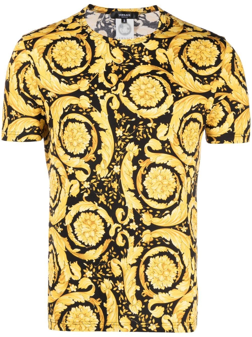 baroque-print crew neck T-shirt black/gold-tone stretch-cotton jersey knit baroque-pattern print crew neck short sleeves straight hem Made in Italy Composition Cotton 94%, Elastane 6% SIZE & FIT Model measurements Height 6 ft 1 in(1.85 m) Bust/Chest 35.82 in(91 cm) Hips 37.79 in(96 cm) Waist 29.13 in(74 cm) FittingInformation This piece fits true to size. We recommend you get your regular size Cut for a slim fit Made with a mid-weight stretch fabric Washing instructions Hand Wash