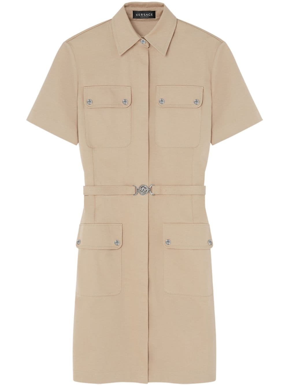 cargo gabardine mini shirt dress Highlights - Beige - Cotton - Gabardine weave - Medusa head motif - Pointed flat collar - Concealed press-stud fastening - Detachable belt - Short sleeves - Four front flap pockets - Thigh-length - Straight hem - Silver-tone hardware Made in Italy Composition Cotton 100%
