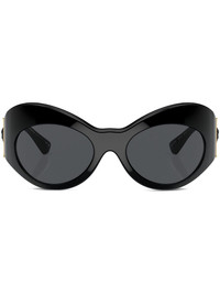 cat-eye frame sunglasses Showcasing a maximalist aesthetic, these Versace Eyewear sunglasses make a bold statement with their oversized cat-eye frame. Crafted in Italy, they feature sculpted arms that display the house's signature Medusa Head motif. Highlights - Black - Acetate - Gold-tone hardware - Cat-eye frame - Grey tinted lenses - Signature greca detailing - Medusa plaque detail - Sculpted arms - Curved tips - These glasses come with a protective case. Made in Italy Composition Acetate 100% SIZE & FIT Measurement Arm Length 4.52 in(11.5 cm) Bridge Width 0.78 in(2 cm) Lens Diameter 2.28 in(5.8 cm)