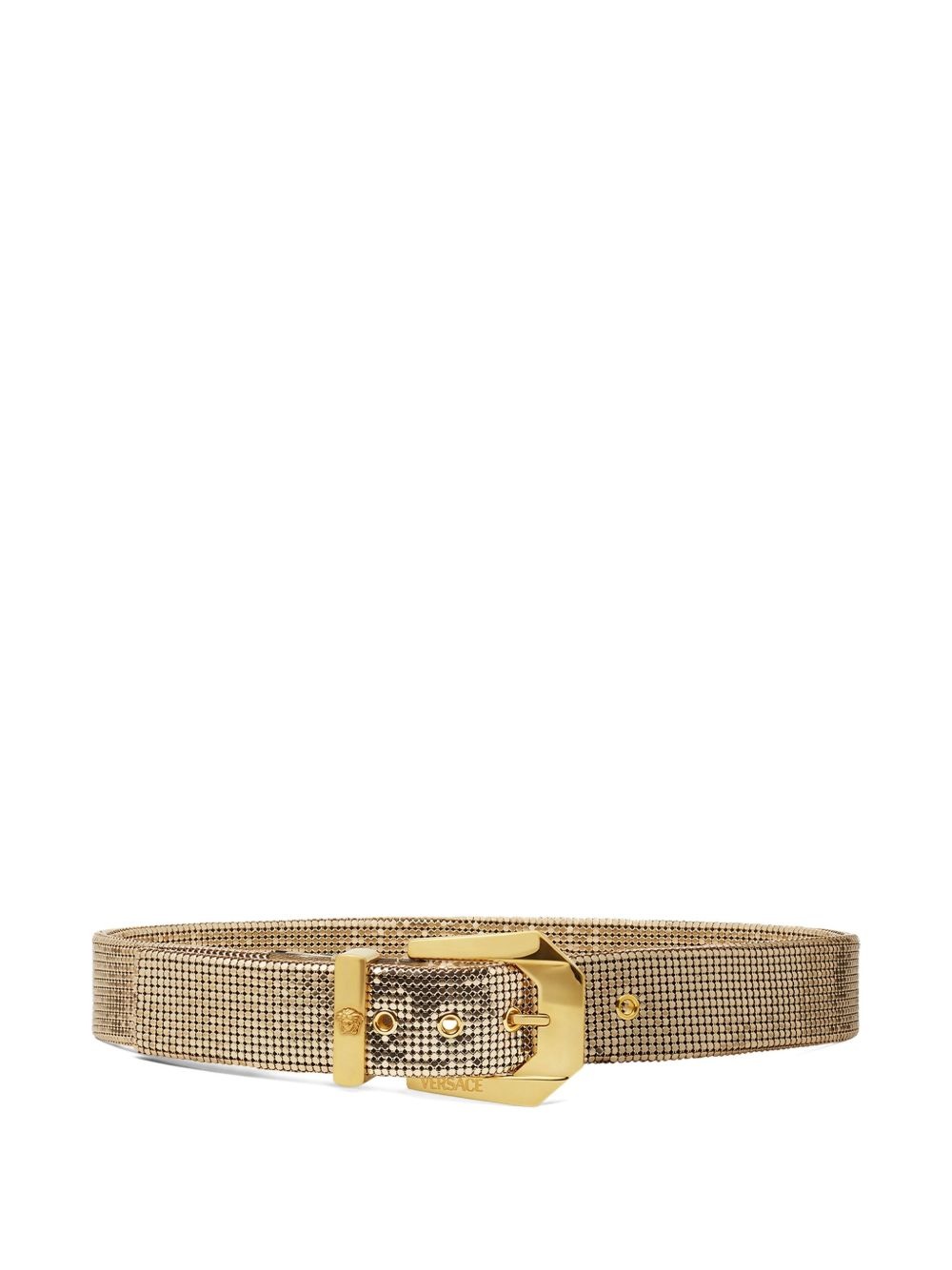 chainmail-embellished metallic belt Highlights - Gold-tone - Shimmering chainmail embellishment - Bold buckle - Adjustable length - Punched holes Made in Italy Composition Metal 100%, Calf Leather 100%