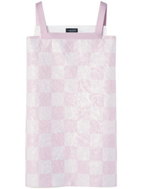 check-print mini dress Keeping in line with Versace's focus on vibrant colours and distinctive details, this mini dress boasts a pink and white check-print design further adorned with an embossed pattern. Made of a silk blend, it features a classic straight cut. Highlights - White/pink - Silk blend - Medusa plaque detail - Embossed detail - Wide shoulder straps - Square neck - Straight hem Made in Italy Composition Polyester 65%, Silk 35%