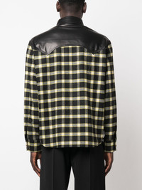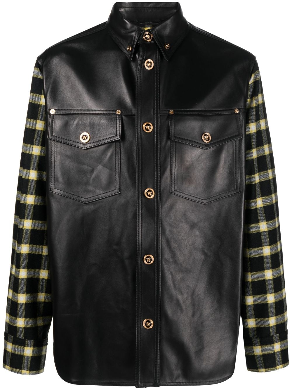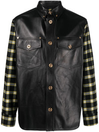 checked-panel shirt jacket Inspired by the floor of ruins in the area of Reggio Calabria, the Medusa is part of the Versace brand identity and the motif embellishes the buttons of this shirt. The garment features a panelled design and two chest patch pockets. Highlights - Black/sunflower yellow/off-white - Calf leather/wool blend - Check pattern - Button-down collar - Front button fastening - Signature medusa head buttons - Long sleeves - Buttoned cuffs - Two chest patch pockets - Curved hem Made in Italy Composition Calf Leather 100%, Wool 70%, Polyamide 30% SIZE & FIT Model measurements Height 6 ft 2 in(1.87 m) Bust/Chest 36.41 in(92.5 cm) Hips 37 in(94 cm) Waist 29.52 in(75 cm) FittingInformation Designed for a boxy fit, intended for a loose fit throughout Soft leather has a supple and smooth construction offering some flexibility This piece fits true to size – take your usual size