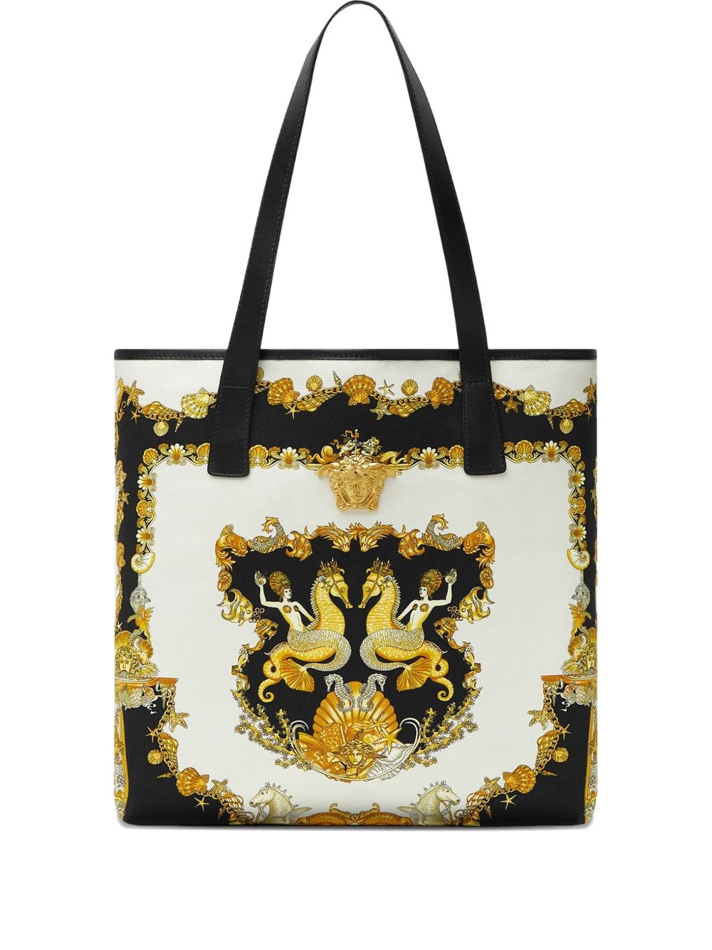 Coral Theatre La Medusa canvas tote bag Highlights - Gold-tone - Coral theatre print - Dual shoulder straps - Embellished details - Open top - Spacious interior Made in Italy Composition Outer: Cotton 100%, Calf Leather 100% Lining: Cotton 100% SIZE & FIT Measurement DEPTH 2.36 in(6 cm) HEIGHT 13.38 in(34 cm) WIDTH 13.38 in(34 cm)