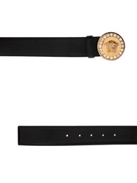 crystal-embellished Medusa-buckle belt Highlights - Black - Gold-tone hardware - Embellished detailing - La medusa detail - Pin buckle fastening - Adjustable fit Made in Italy Composition Outer: Calf Leather 100% SIZE & FIT Measurement WIDTH 1.57 in(4 cm)