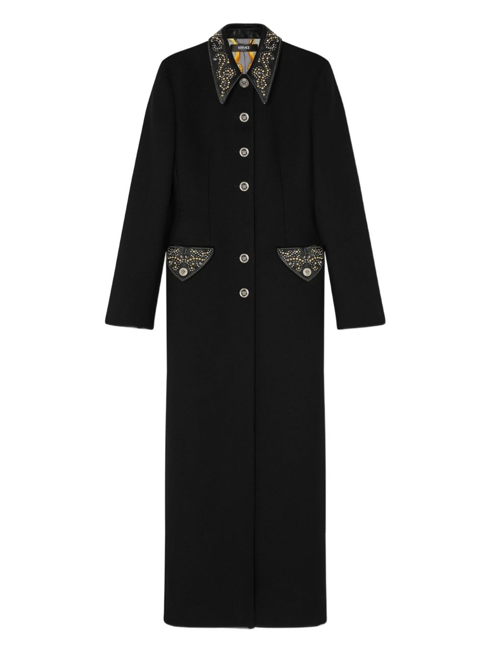 embellished-collar coat Highlights - Black - Embellished collar - Button fastening - Flap pockets Made in Italy Composition Wool 86%, Polyamide 14% Washing instructions Read Manufacturer Guidelines