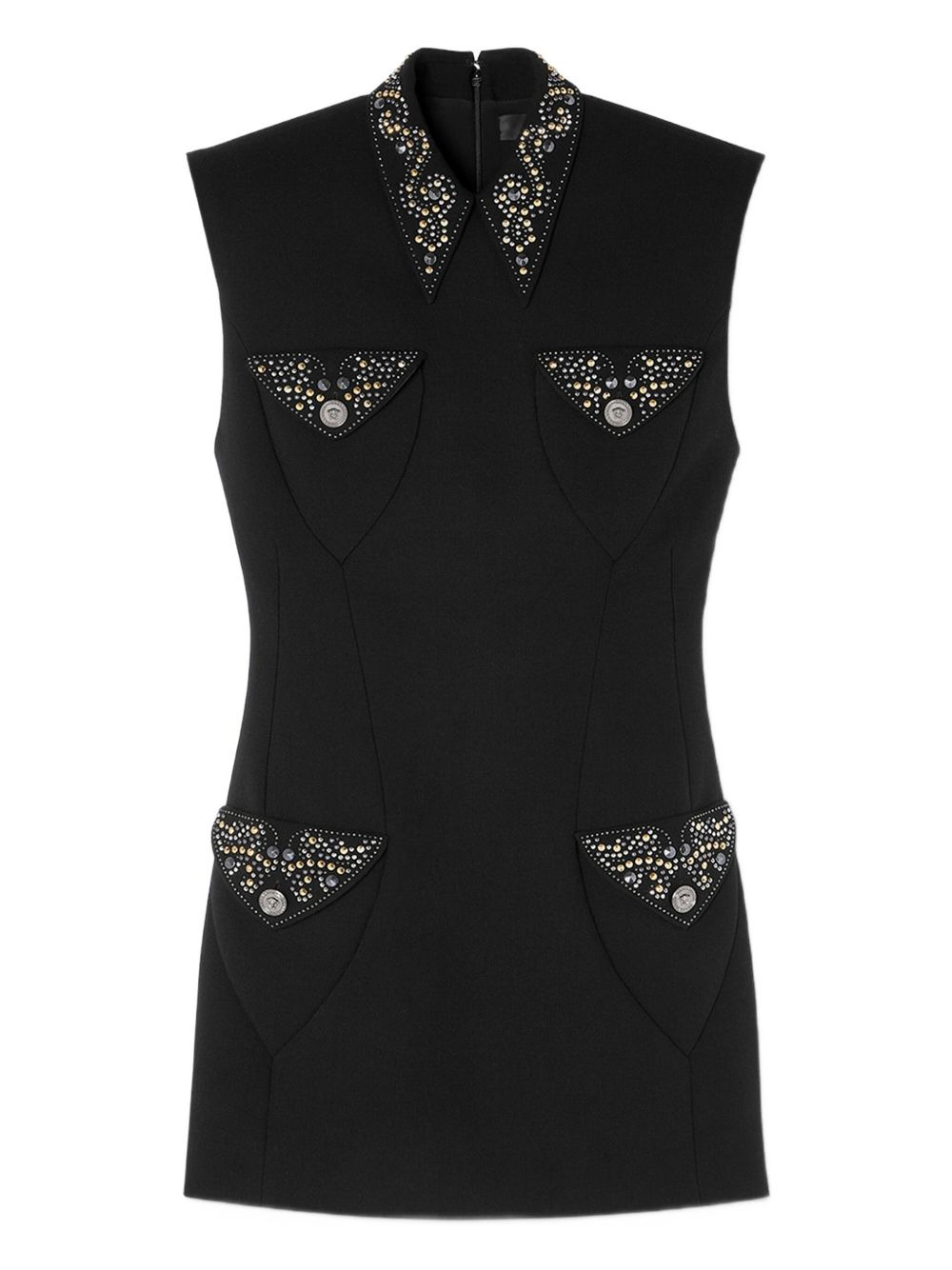 embellished wool mini dress Highlights - Black - Wool fabric - Jewel embellishment - Sleeveless design - Flap pockets Made in Italy Composition Virgin Wool 100% Washing instructions Read Manufacturer Guidelines