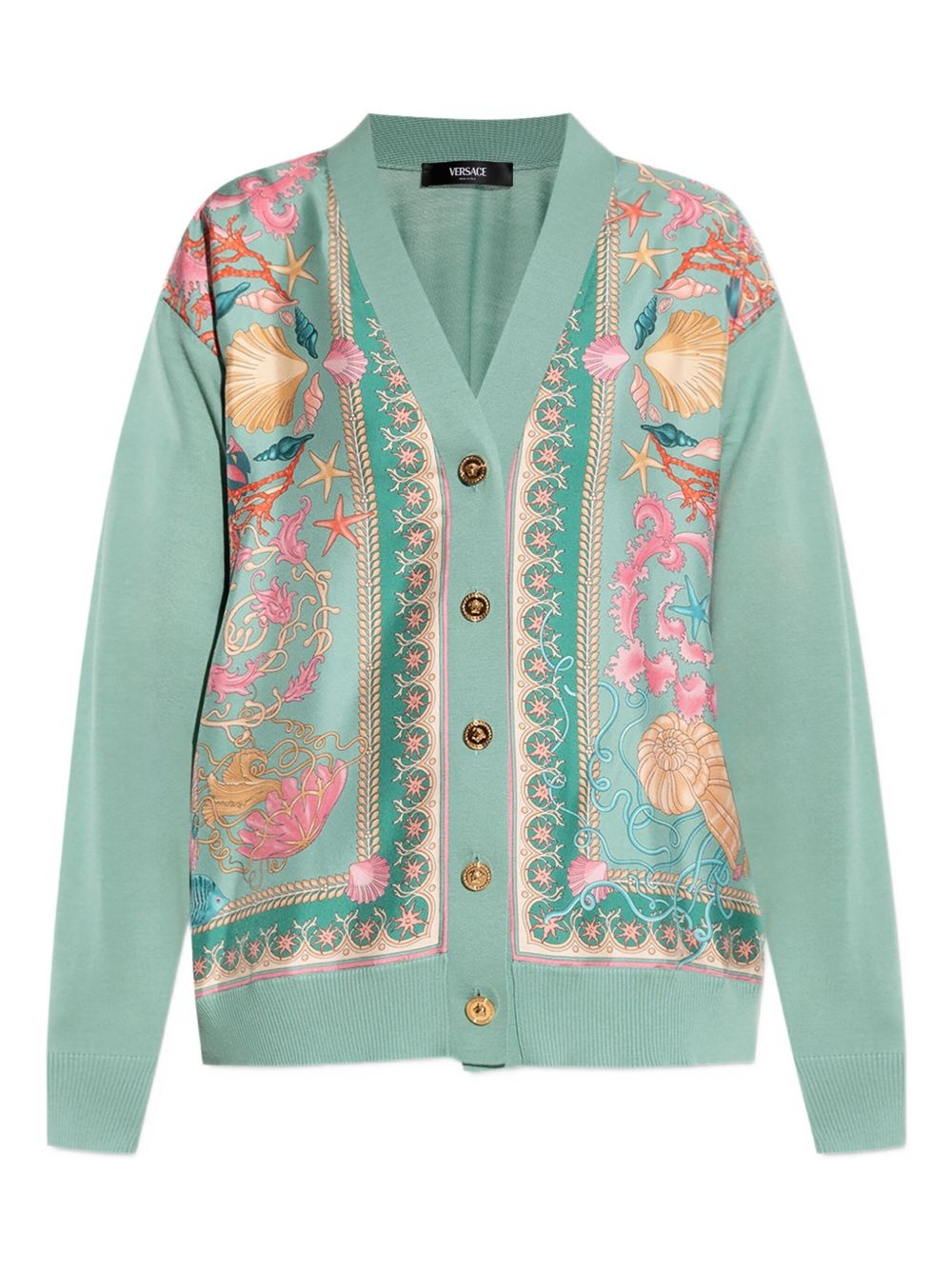 embroidered cardigan Highlights - Mint green - Embroidered shell and starfish motifs - V-neckline - Button fastening - Ribbed cuffs - Decorative piping detail Made in Italy Composition Virgin Wool 70%, Silk 30% Washing instructions Read Manufacturer Guidelines