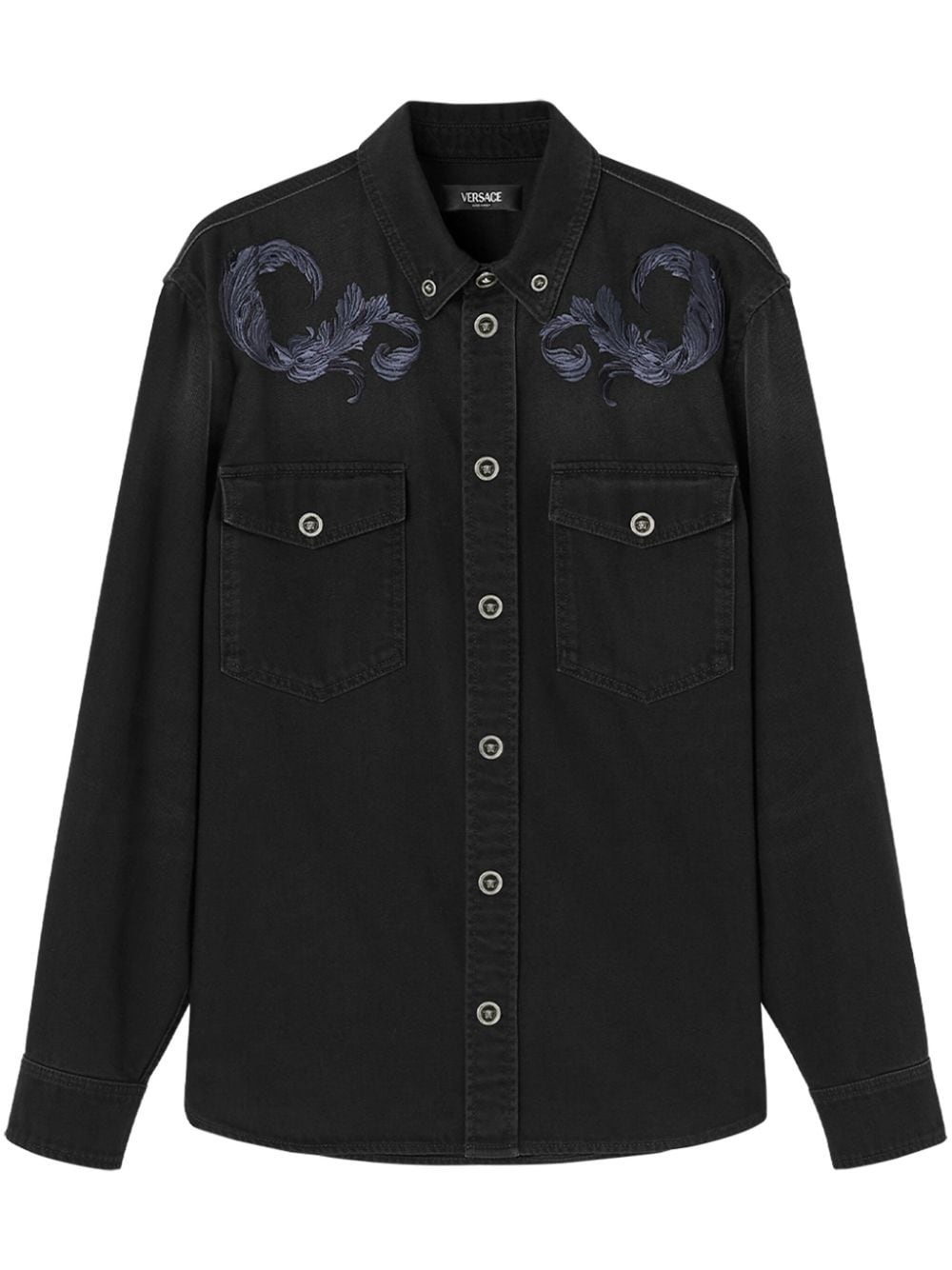 Barocco embroidered denim overshirt Highlights - Black/blue - Cotton blend - Denim - Embroidered design - Signature medusa head buttons - Spread collar - Front button fastening - Long sleeves - Buttoned cuffs - Two chest flap pockets - Curved hem Made in Italy Composition Cotton 87%, Polyester 13% SIZE & FIT Measurement CHEST 44.01 in(111.8 cm) SLEEVE LENGTH 24.48 in(62.2 cm) LENGTH 27.51 in(69.9 cm) WAIST 42 in(106.7 cm) Shoulder Width 16.49 in(41.9 cm) Washing instructions Read Manufacturer Guidelines