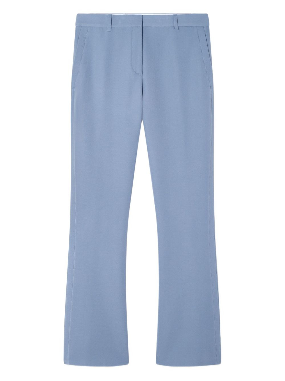 flared trousers Highlights - Light blue - Flared leg - Concealed front fastening - Two diagonal pockets - Belt loops - Wool blend Imported Composition Outer: Wool 78%, Polyester 22% Lining: Cupro 100% Washing instructions Read Manufacturer Guidelines