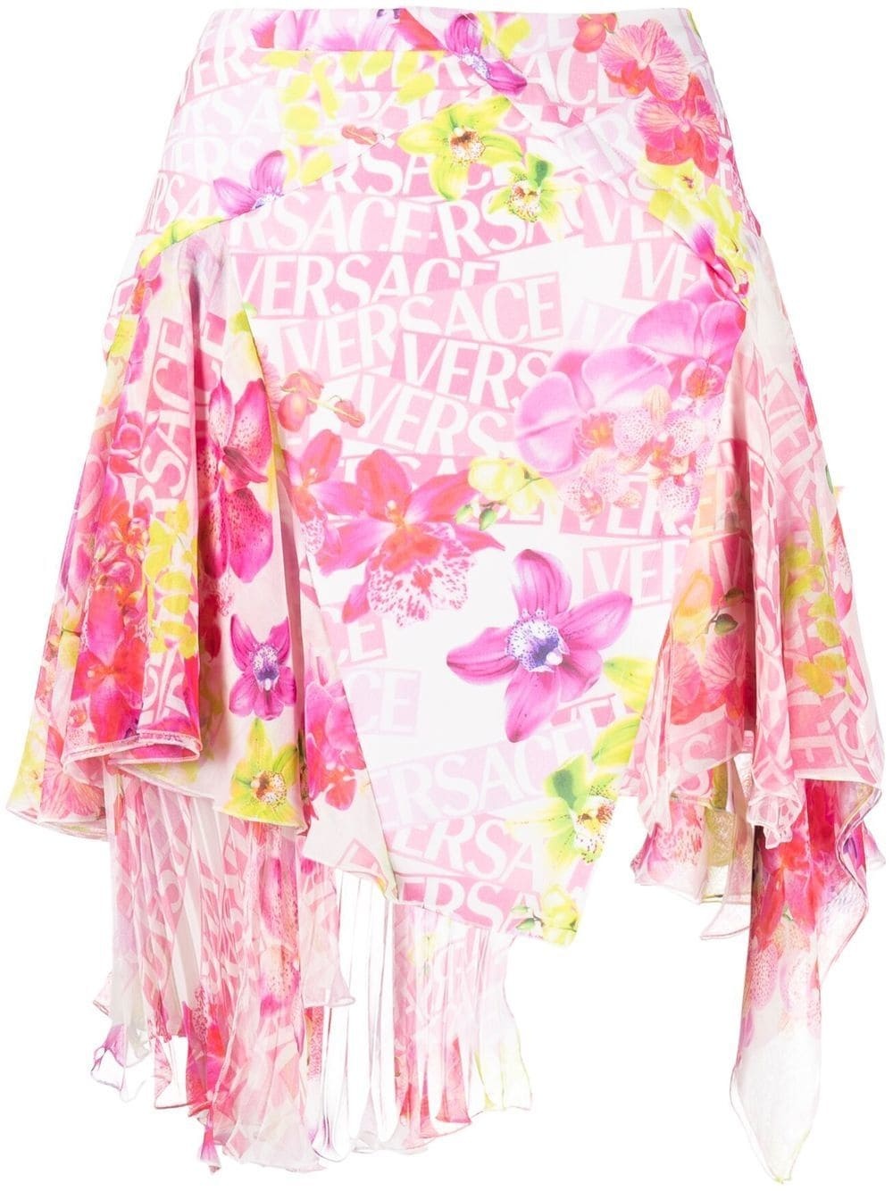 floral-print asymmetric skirt This skirt from Versace is imbued with retro inspiration. Saturated with a Logo Orchid print taken from the label’s archives, the asymmetric silhouette is punctuated with tiered ruffles, recalling playful 00s styles. Made in Italy Composition Outer: Silk 100% Lining: Acetate 75%, Silk 25% SIZE & FIT Model measurements Height 5 ft 10 in(1.77 m) Bust/Chest 32.28 in(82 cm) Hips 34.25 in(87 cm) Waist 24.01 in(61 cm) FittingInformation This piece fits true to size. We recommend you get your regular size Designed to be fitted at the waist and hips, loose over the leg Made with a mid-weight non-stretch fabric