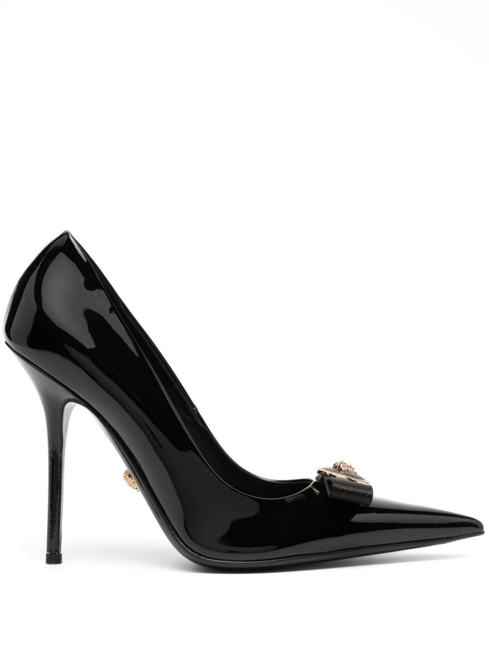 120mm Gianni pumps Named after Versace's founder, the Gianni pumps are mostly defined by the opulent Medusa bow. Placed over the pair's pointed toe, it showcases the brand's archival stitching and iconic Medusa Head plaque as a celebration of the designer's connection to Greek mythology. Highlights - Black - Calf leather - Patent finish - Medusa head motif - Bow detailing - Signature gianni stitching - Pointed toe - Branded heel counter - High stiletto heel Made in Italy Composition Outer: Patent Calf Leather 100% Sole: Calf Leather 100% Lining: Calf Leather 100% SIZE & FIT Measurement HEEL 4.33 in(11 cm)