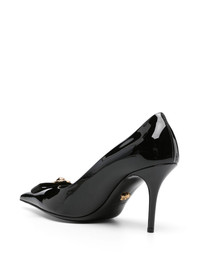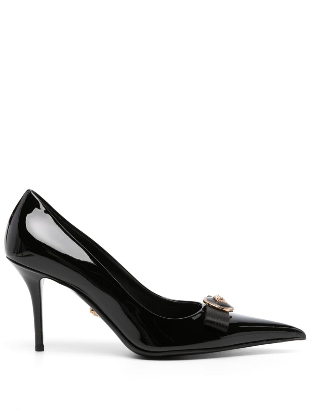 85mm Gianni Ribbon pumps These Versace point-toe pumps are decorated with the Nastro Gianni bow and Medusa plaque hardware at the front. They're sculpted in Italy from glossy black leather and set atop towering stiletto heels. Highlights - Black - Calf leather - Patent finish - Medusa head motif - Pointed toe - Branded leather insole - Stiletto heel - Gold-tone hardware Made in Italy Composition Outer: Patent Calf Leather 100% Lining: Calf Leather 100% Sole: Calf Leather 100% SIZE & FIT Measurement HEEL 3.14 in(8 cm)
