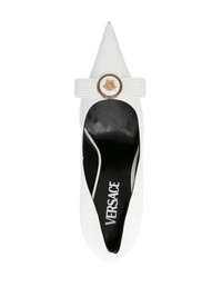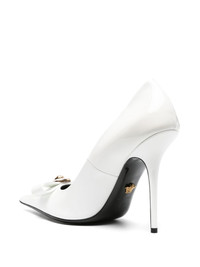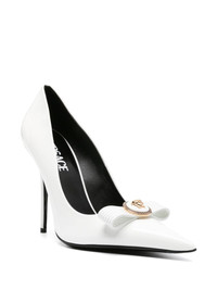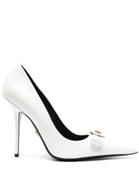 110mm Gianni Ribbon patent pumps Archival motifs are a Versace mainstay that often pay tribute to its late founder. These Gianni Ribbon pumps take their name and details from the eponymous designer – both the satin nastro Gianni bows and Medusa Head hardware at the point toes hail from his foundational era. Highlights - White - Calf leather - Patent finish - Nastro gianni bow detailing - Medusa plaque detail - Branded insole - Pointed toe - Slip-on style - 110mm stiletto heel Made in Italy Composition Lining: Calf Leather 100% Outer: Patent Calf Leather 100% Sole: Calf Leather 100% SIZE & FIT Measurement HEEL 4.33 in(11 cm)