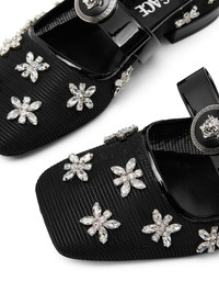 Gianni Ribbon crystal-embellishment ballerina shoes Highlights - Black - Calf leather - Crystal embellishment - Low block heel - Medusa plaque detail - Signature gianna ribbon detailing - Slip-on style - Square toe - Branded leather insole Made in Italy Composition Sole: Calf Leather 100% Lining: Goat Skin 100%, Nylon 100%, Lambskin 100% Outer: Polyester 100%