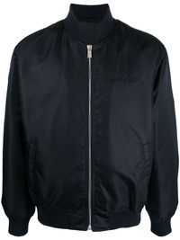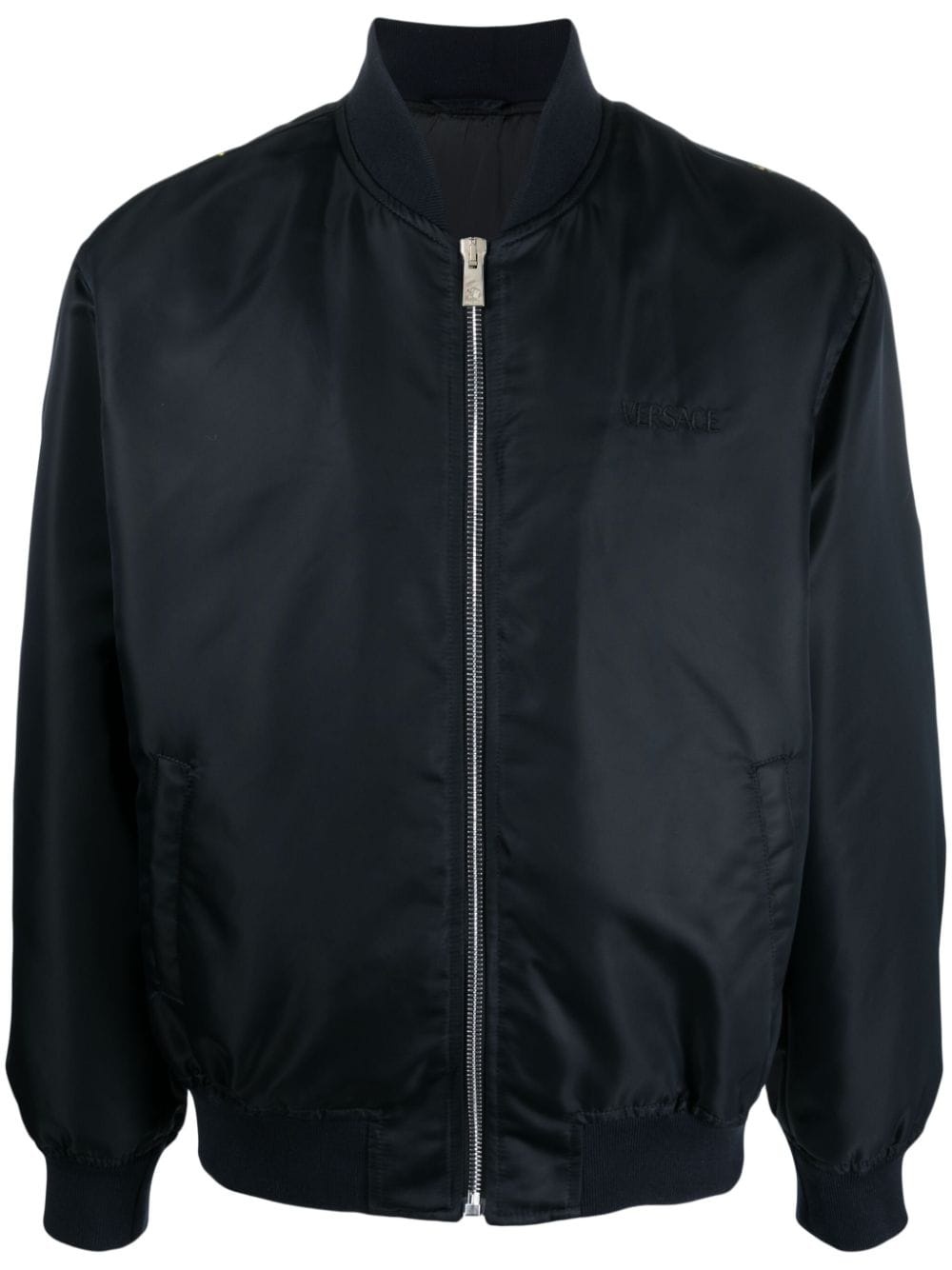 graphic-print bomber jacket In a nod to Versace's preference for bold branding, large logo lettering and a city landscape illuminate the rear of this bomber jacket, while an understated embroidered logo is stitched on the chest in tonal threads. Highlights - Navy blue/multicolour - Cotton - Satin finish - Embroidered logo at the chest - Logo print to the rear - Graphic print to the rear - Stand-up collar - Front zip fastening - Long sleeves - Ribbed cuffs and hem - Two side slit pockets Made in Italy Composition Outer: Polyamide 100%, Viscose 100% Lining: Cupro 100%, Polyester 100%, Cotton 100% SIZE & FIT Model measurements Height 6 ft 2 in(1.89 m) Bust/Chest 37.79 in(96 cm) Hips 37 in(94 cm) Waist 29.92 in(76 cm) FittingInformation Designed for a regular fit, allowing for a comfortably loose fit throughout the body The ribbed hem offers a close, comfortable fit Made from a padded non-stretch fabric, giving it no natural elasticity This piece fits true to size – take your usual size Washing instructions Dry Clean Only