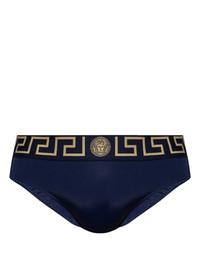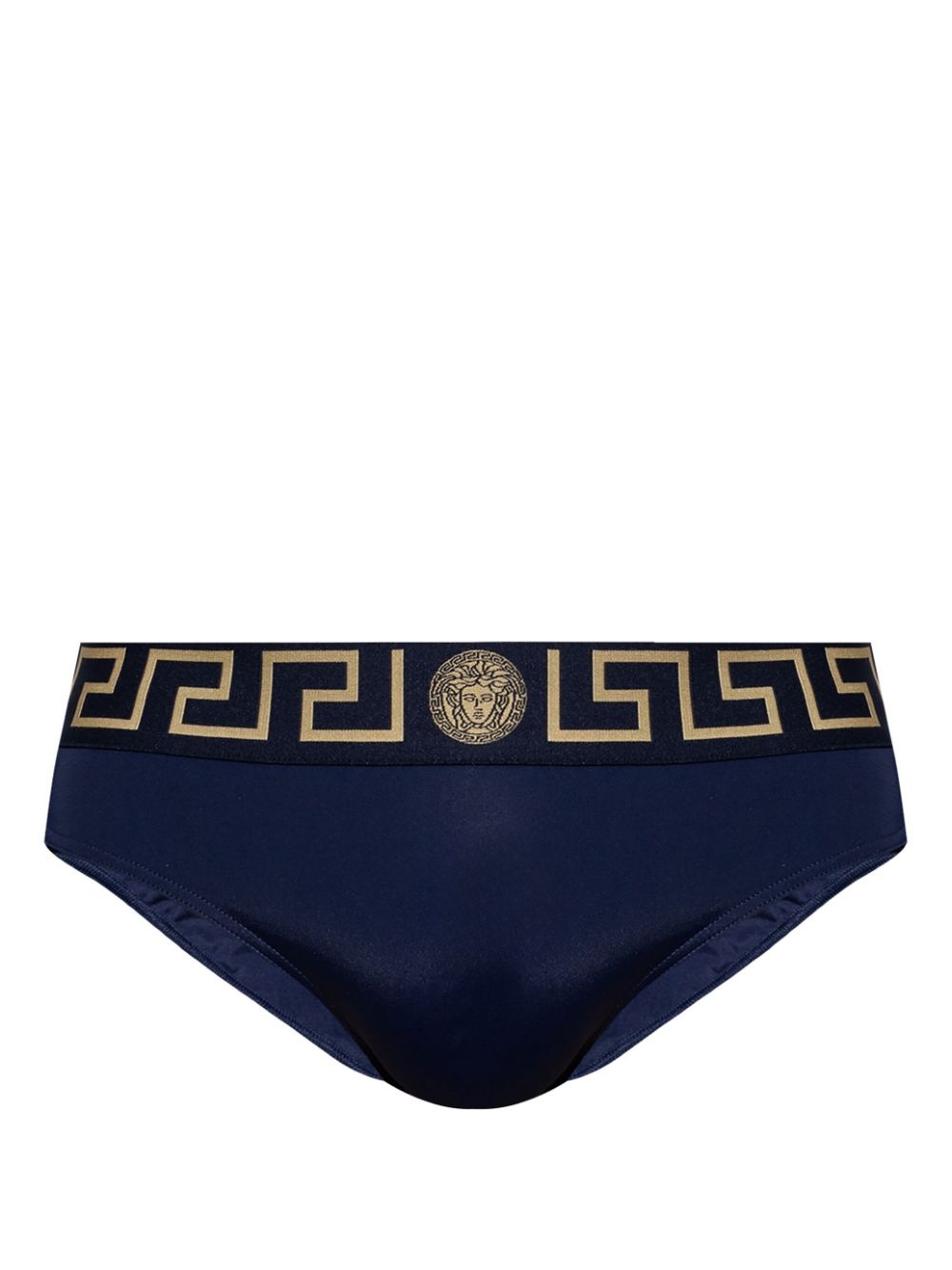 Greca Border briefs Highlights - Navy blue - Stretch-cotton - Medusa head motif - Signature greca detailing - Elasticated logo waistband - Classic bottoms - Be mindful to try on swimwear over your own garments. Made in Italy Composition Polyamide 78%, Spandex/Elastane 22%