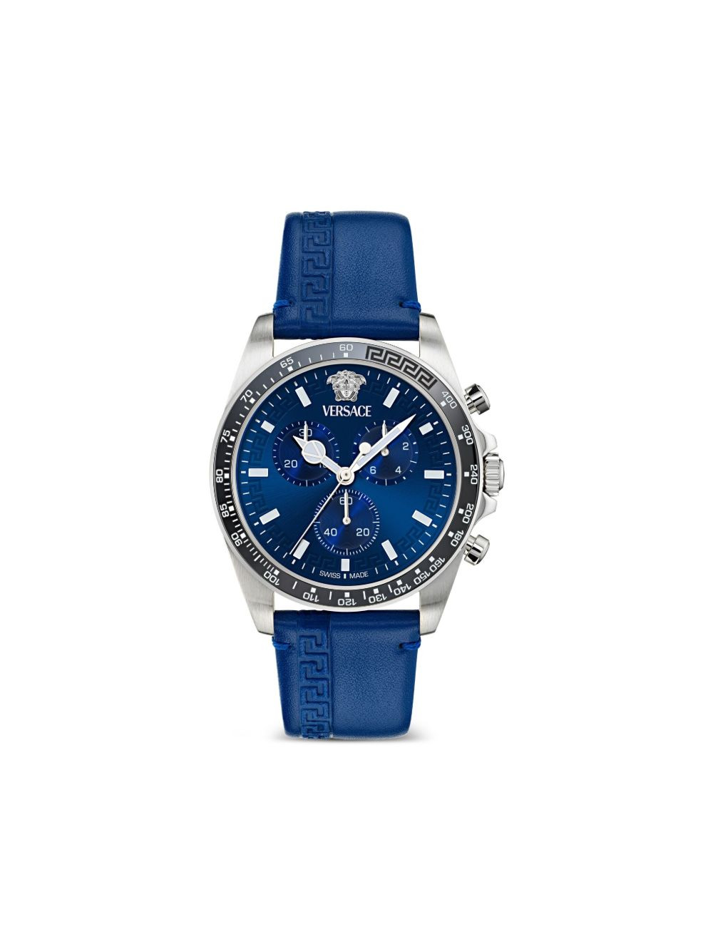 Greca Chrono 43mm Highlights - Blue dial - Stainless steel case - Round case shape - Chronograph dial - Greca bezel - Swiss movement - Screw-down crown - This item comes with a standard one-year warranty from the boutique. Imported Composition Calf Leather 100%, stainless steel 100%