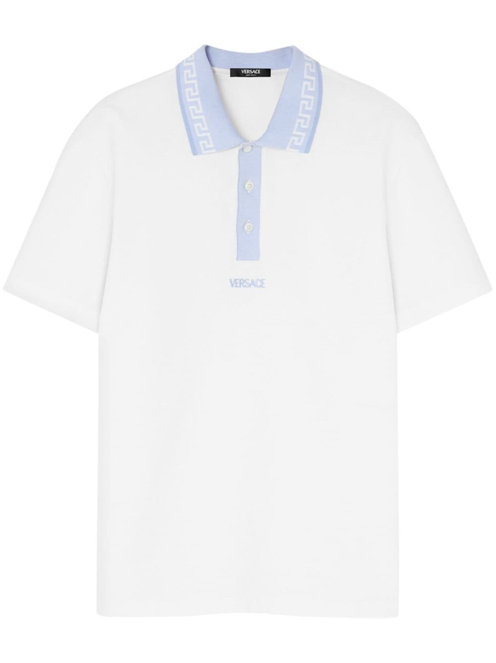 Greca-collar polo shirt Highlights - White - Short sleeves - Polo collar - Straight hem - Front button fastening - Signature barocco print - Embroidered logo at the chest Made in Italy Composition Fabric 100% SIZE & FIT FittingInformation Designed for a regular fit, this polo shirt offers a comfortable loose fit throughout the body Made from a midweight non-stretch fabric Washing instructions Read Manufacturer Guidelines