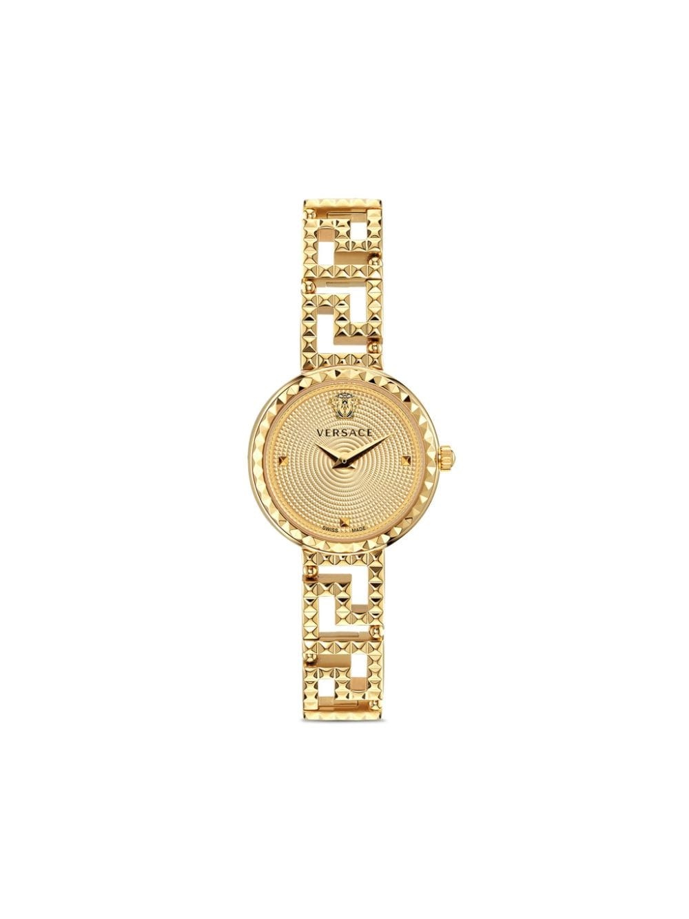 Greca Labyrinth 28mm Highlights - Stainless steel - Quartz movement - Gold-tone - Medusa head motif - Round face - Logo-engraved bezel - Stainless steel link bracelet - This item comes with a standard one-year warranty from the brand. Imported SIZE & FIT Measurement DIAMETER 1.1 in(2.8 cm)