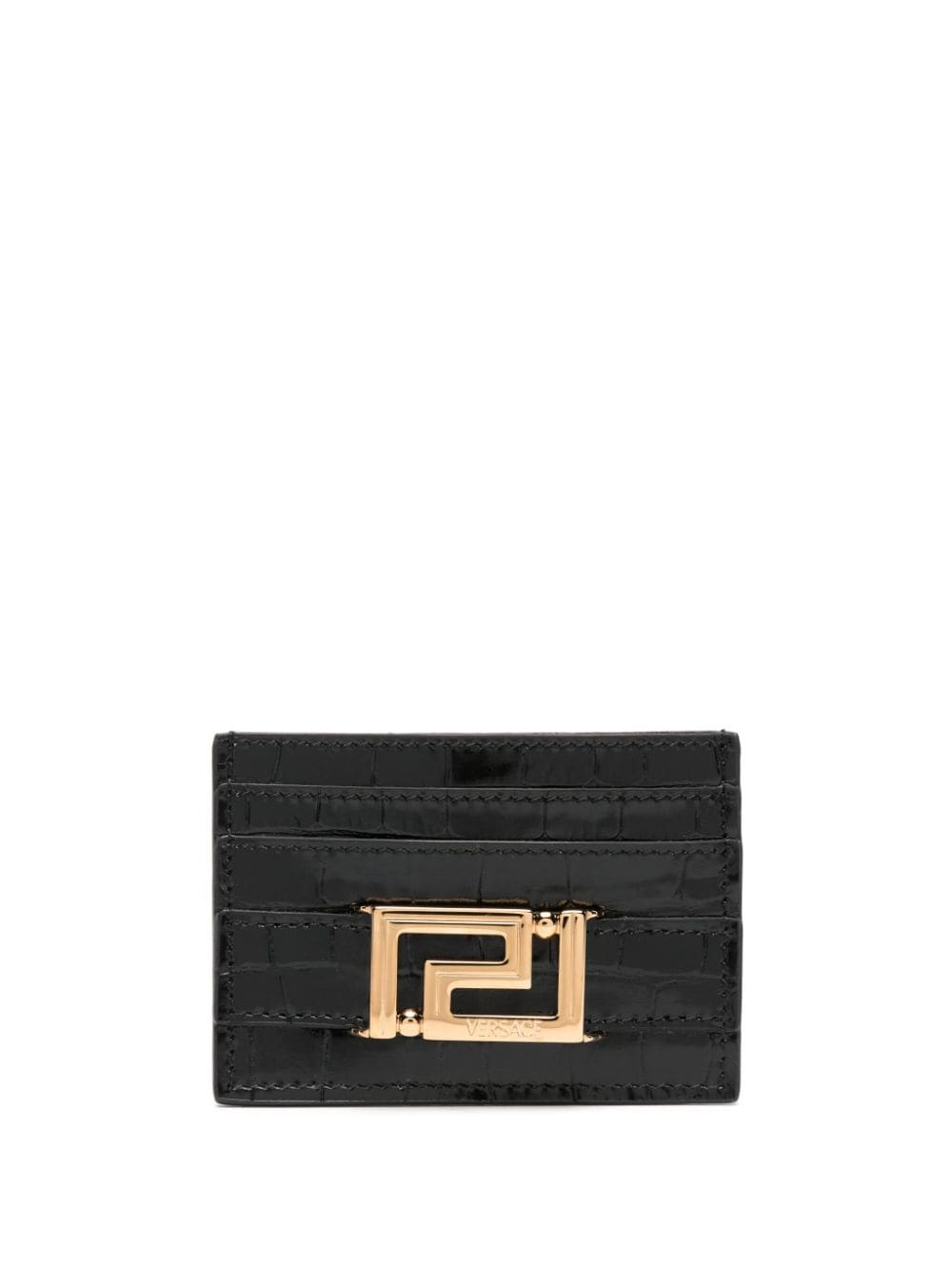 Greca Goddess crocodile-embossed cardholder Cut from leather to a slim silhouette with four card slots and a slip pocket, this black Versace cardholder is imbued with the brand's signature high-octane energy thanks to the embossed crocodile effect and golden Greca chain hardware. Highlights - Black/gold-tone - Calf leather - Embossed crocodile effect - Signature greca detailing - Card slots - Internal slip pocket Made in Italy Composition Outer: Calf Leather 100% SIZE & FIT Measurement LENGTH 3.93 in(10 cm) WIDTH 2.75 in(7 cm)