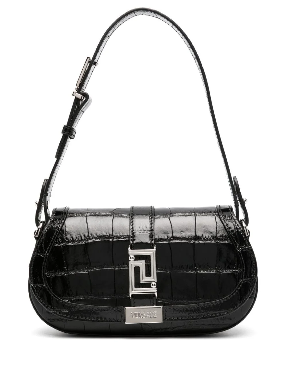 Greca Goddess shoulder bag This shoulder bag showcases one of Versace's biggest brand hallmarks: the geometric Greca Goddess chain. The signature hardware details the strap and front of the compact accessory, which is crafted in black crocodile-effect leather. Highlights - Black - Calf leather - Embossed crocodile effect - Patent finish - Signature greca detailing - Silver-tone logo plaque and hardware - Adjustable shoulder strap - Foldover top with magnetic fastening - Main compartment - Internal slip pocket Made In Italy Composition Outer: Calf Leather 100% Lining: Lamb Skin 100% SIZE & FIT Model measurements Height 5 ft 10 in(1.77 m) Bust/Chest 32.28 in(82 cm) Hips 35.03 in(89 cm) Waist 25.19 in(64 cm) Measurement DEPTH 2.36 in(6 cm) HANDLE 7.87 in(20 cm) HEIGHT 4.33 in(11 cm) WIDTH 8.26 in(21 cm)