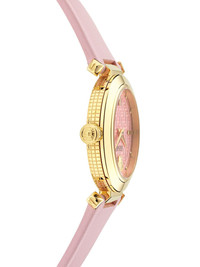 Greek Key Dial 35mm Highlights - Pink dial - Pink leather strap - Round case shape - 35mm case size - Pink patterned dial - Greek key motif dial - Gold-tone bezel - Quartz movement - Gold-tone crown - This item comes with a standard one-year warranty from the boutique. Imported