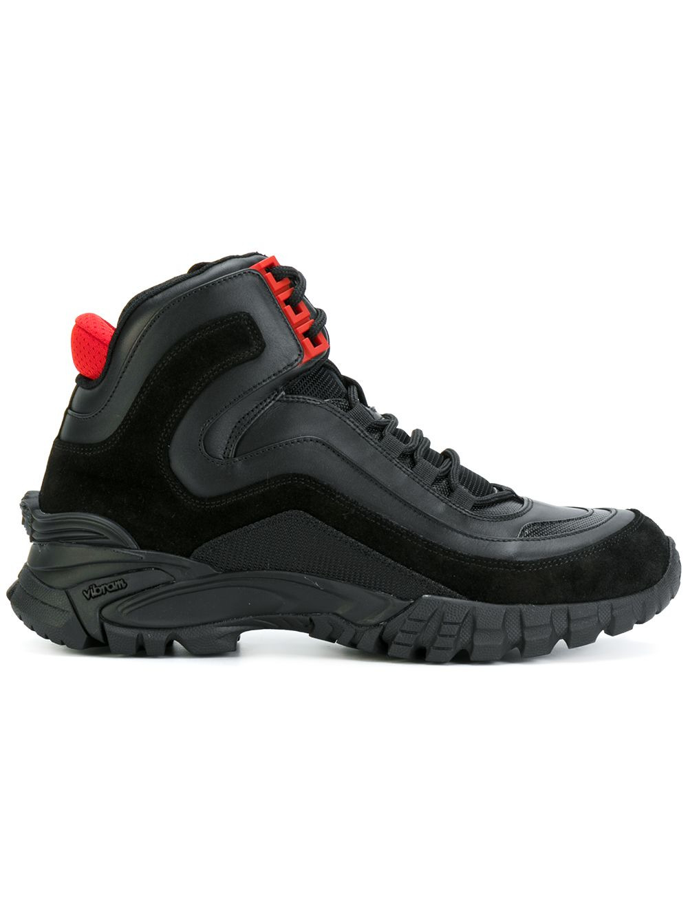Greek key formal sneakers A classic sports silhouette is lent Versace's luxurious finishing in these high-top Greek Key Formal sneakers from the label's AW17 collection. Expertly constructed in Italy from black and red panels of suede, leather and mesh, these shoes are appropriate for both physical activity or weekend events. They feature a round toe, a lace-up front fastening, a branded insole and a ridged rubber sole embossed with Versace's signature Greek Key detail and Medusa head motif. Made in Italy Composition Outer: Calf Leather 100%, Suede 100%, Polyester 100% Sole: Rubber 100% Lining: Calf Leather 100% SIZE & FIT Measurement Sole height 0.59 in(1.5 cm) HEIGHT 3.14 in(8 cm) HEEL 2.16 in(5.5 cm)