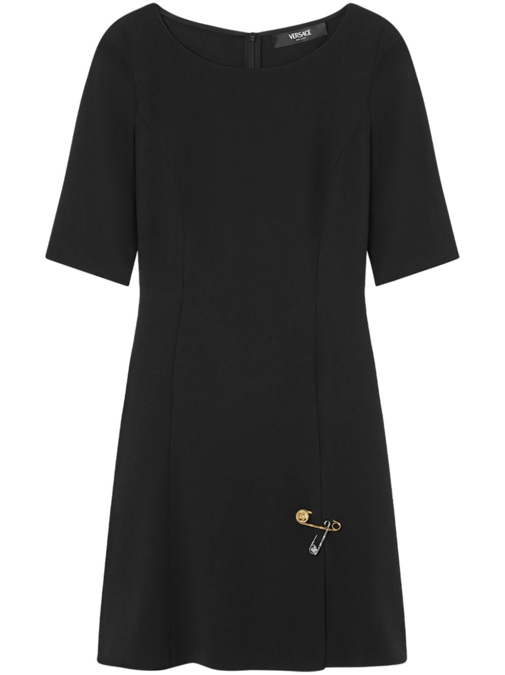Safety Pin flared satin mini dress Highlights - Black - Crew neck - Half-length sleeves - Safety pin detail - Rear zip fastening Made in Italy Composition Polyamide 74%, Viscose 26%