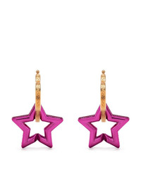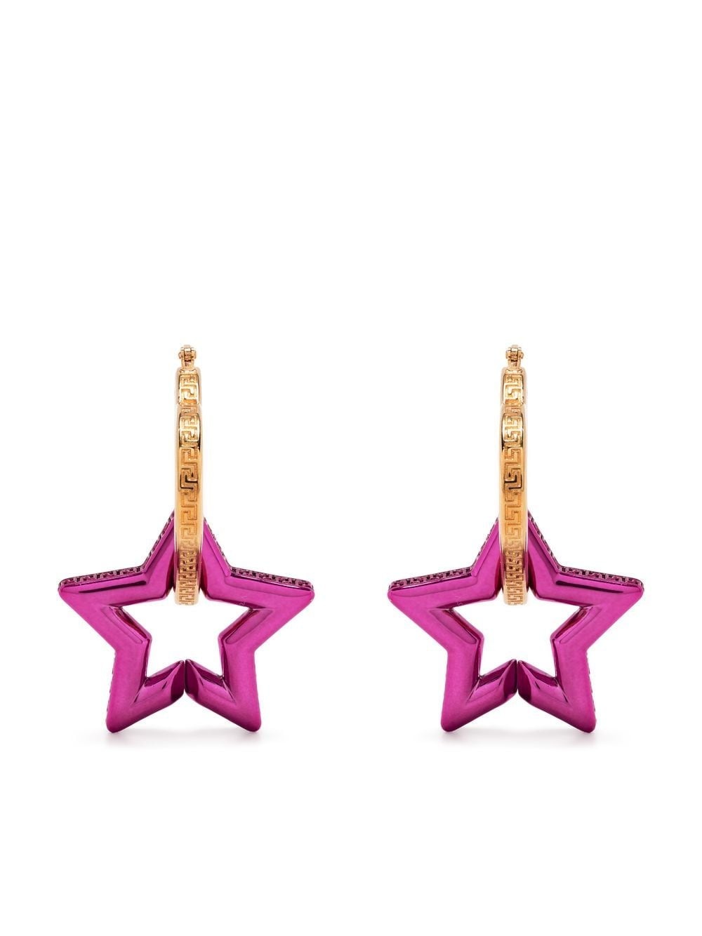 Greca star-shaped drop earrings Suspended from a heart-shaped hoop, these drop earrings by Versace boast a star pendant engraved with the signature Greca motif along the sides. Contrasting a gold tone with pink, the pair lends a romantic mood. Highlights - Hot pink/gold-tone - Heart hoop - Star pendant - Signature greca detailing - Hinge-pin fastening - These earrings come as a pair. Made in Italy SIZE & FIT Model measurements Height 5 ft 10 in(1.77 m) Bust/Chest 32.28 in(82 cm) Hips 35.03 in(89 cm) Waist 25.19 in(64 cm) Measurement HEIGHT 1.96 in(5 cm) WIDTH 1.18 in(3 cm)