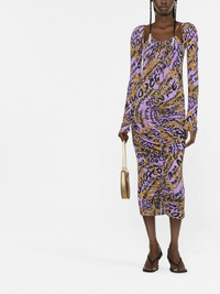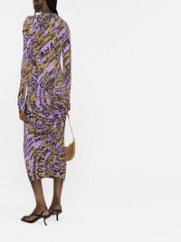 all-over logo-print gathered dress lavender purple stretch-design gathered detailing all-over logo print round neck long sleeves mid-length Imported Composition Lining: Polyamide 100% Outer: Viscose 95%, Spandex/Elastane 5% SIZE & FIT Model measurements Height 5 ft 10 in(1.79 m) Bust/Chest 31.1 in(79 cm) Hips 35.03 in(89 cm) Waist 24.01 in(61 cm) FittingInformation This piece fits true to size. We recommend you get your regular size Cut for a close fit Made with a mid-weight stretch fabric
