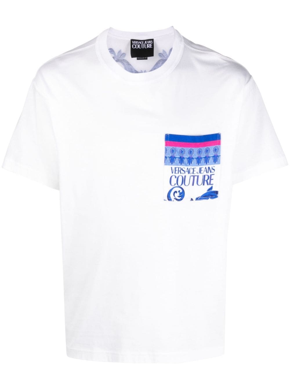 Barocco-print cotton T-shirt Highlights - White/blue - Cotton - Jersey texture - Signature barocco print - Logo print at the chest - Logo print to the rear - Crew neck - Drop shoulder - Short sleeves - Chest patch pocket - Straight hem Made in Italy Composition Cotton 100% SIZE & FIT Model measurements Height 6 ft 1 in(1.86 m) Bust/Chest 37.4 in(95 cm) Hips 36.22 in(92 cm) Waist 29.52 in(75 cm) Measurement CHEST 42.51 in(108 cm) SLEEVE LENGTH 7.87 in(20 cm) LENGTH 27.16 in(69 cm)