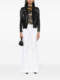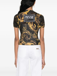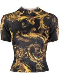Barocco-print glitter knitted top Highlights - Black/gold-tone - Fine knit - Semi-sheer construction - All-over barocco print - Logo patch to the rear - Glitter detailing - Mock neck - Short sleeves - Ribbed cuffs and hem Imported Composition Viscose 90%, Polyester 10% SIZE & FIT Model measurements Height 5 ft 10 in(1.77 m) Bust/Chest 31.1 in(79 cm) Hips 34.64 in(88 cm) Waist 24.8 in(63 cm) FittingInformation Designed for a close fit throughout Made with a midweight knit, this piece offers some stretch This piece fits true to size – take your usual size