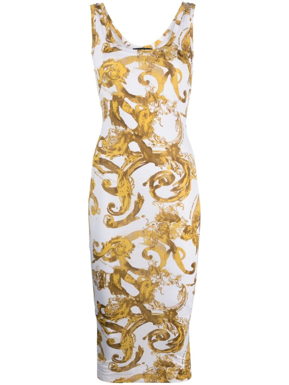 Barocco-print midi dress Highlights - White/yellow - Stretch-design - Signature barocco print - Scoop neck - Thin shoulder straps - Sleeveless - Straight hem - Below-knee length Made in Italy Composition Viscose 90%, Elastane 10% SIZE & FIT Model measurements Height 5 ft 10 in(1.77 m) Bust/Chest 31.1 in(79 cm) Hips 34.64 in(88 cm) Waist 24.8 in(63 cm) Washing instructions Machine Wash