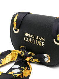 embellished faux-leather mini bag This shoulder bag by Versace Jeans Couture is characterised by the Chain Couture-print scarf threaded through the front flap, which marries some of the house’s most iconic motifs into one graphic. It’s crafted to a mini saddle silhouette from faux leather with a durable cross-grain finish and detailed with gold-tone logo lettering. Highlights - Black - Faux leather - Scarf detailing - Detachable leather and chain-link shoulder strap - Gold-tone logo lettering - Foldover top with magnetic fastening - Main compartment - Internal logo plaque - Gold-tone hardware Imported Composition Outer: Polyester 100%, Polyurethane Resin 100% Lining: Polyester 100% SIZE & FIT Model measurements Height 5 ft 11 in(1.8 m) Bust/Chest 34.25 in(87 cm) Hips 35.82 in(91 cm) Waist 24.8 in(63 cm) Measurement DEPTH 2.36 in(6 cm) HEIGHT 4.33 in(11 cm) STRAP 22.04 in(56 cm) WIDTH 7.08 in(18 cm)