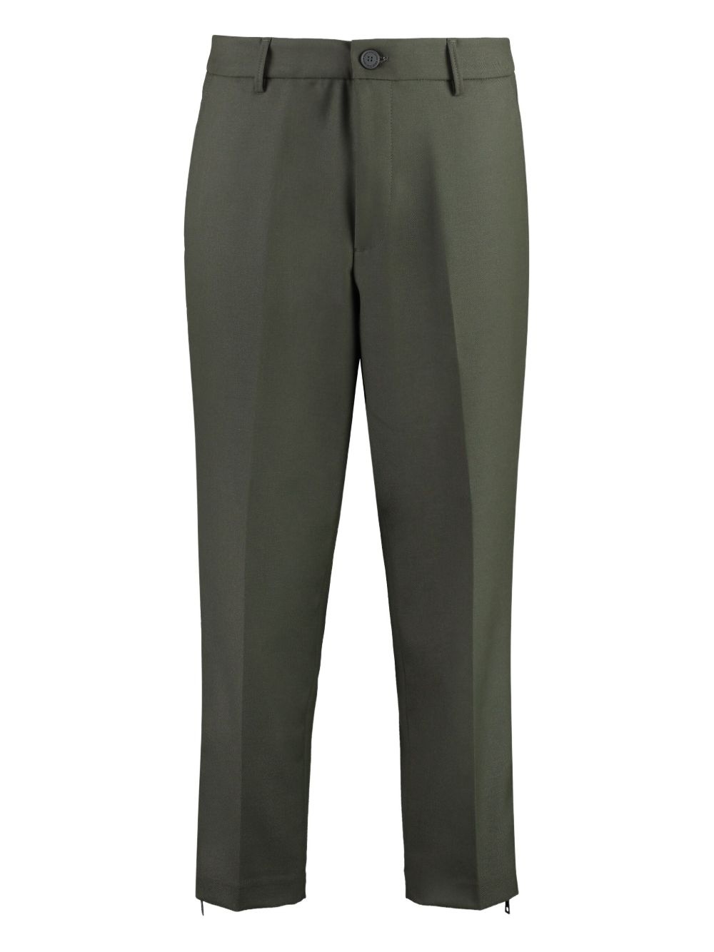 creased straight-leg trousers Highlights - Olive green - Button and zip front fastening - Two rear welt pockets - Ankle zips - Belt loops - Logo patch on the rear Imported Composition Polyester 69%, Viscose 30%, Elastane 1% Washing instructions Read Manufacturer Guidelines