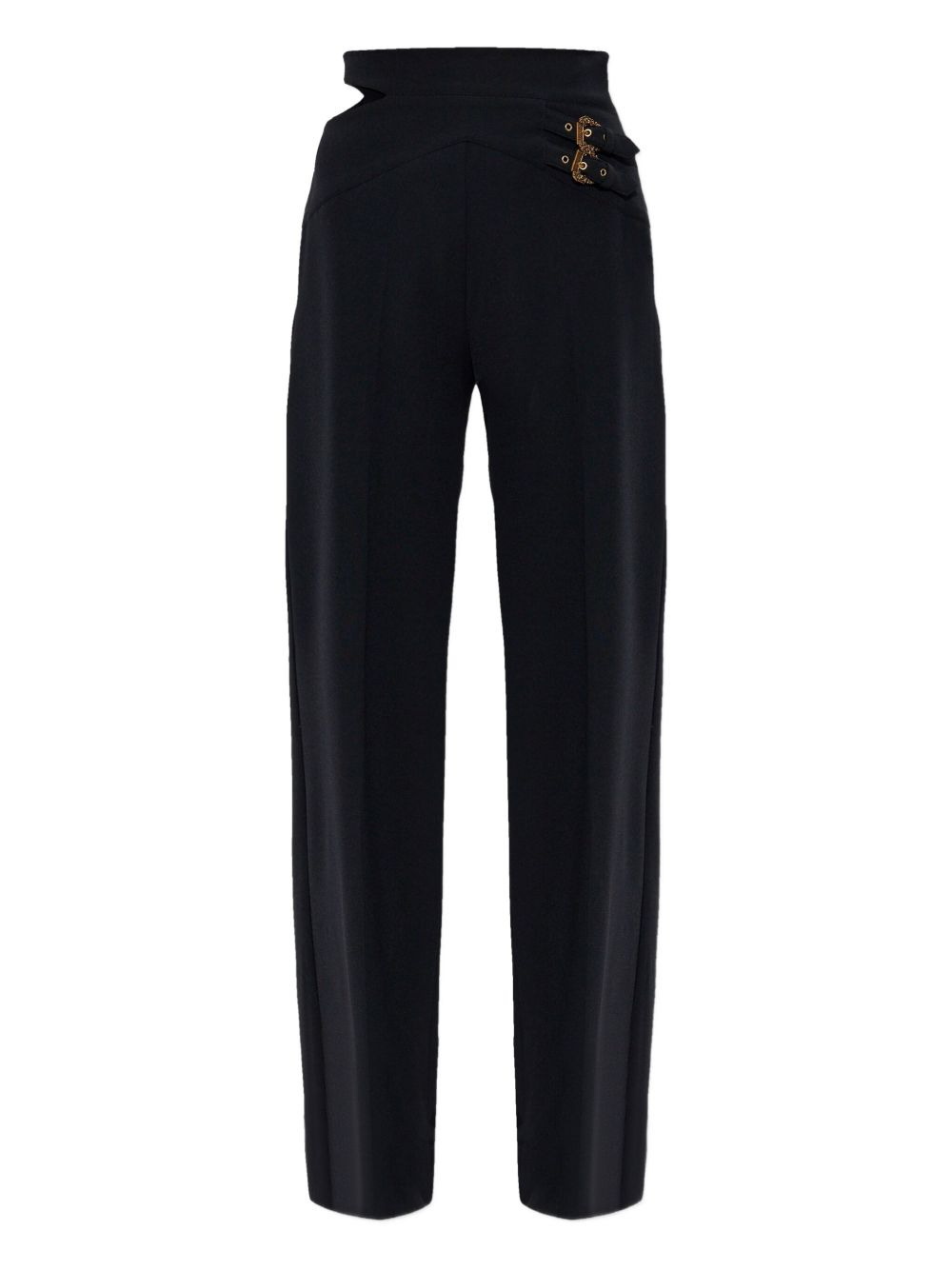 cut-out buckle-detail trousers Highlights - Black - Cut-out detailing - Double buckle fastening - High waist - Straight hem Imported Composition Viscose 49%, Polyamide 42%, Elastane 9% Washing instructions Read Manufacturer Guidelines