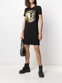 foil-print T-shirt dress Black cotton foil-print T-shirt dress from VERSACE JEANS COUTURE featuring a metallic print, a round neck, short sleeves, a slim fit and a short length. Imported Composition Cotton 100% SIZE & FIT Model measurements Height 5 ft 9 in(1.76 m) Bust/Chest 33.07 in(84 cm) Hips 34.64 in(88 cm) Waist 25.59 in(65 cm) FittingInformation This piece fits true to size. We recommend you get your regular size Cut for a relaxed fit Made with a mid-weight fabric Washing instructions Hand Wash
