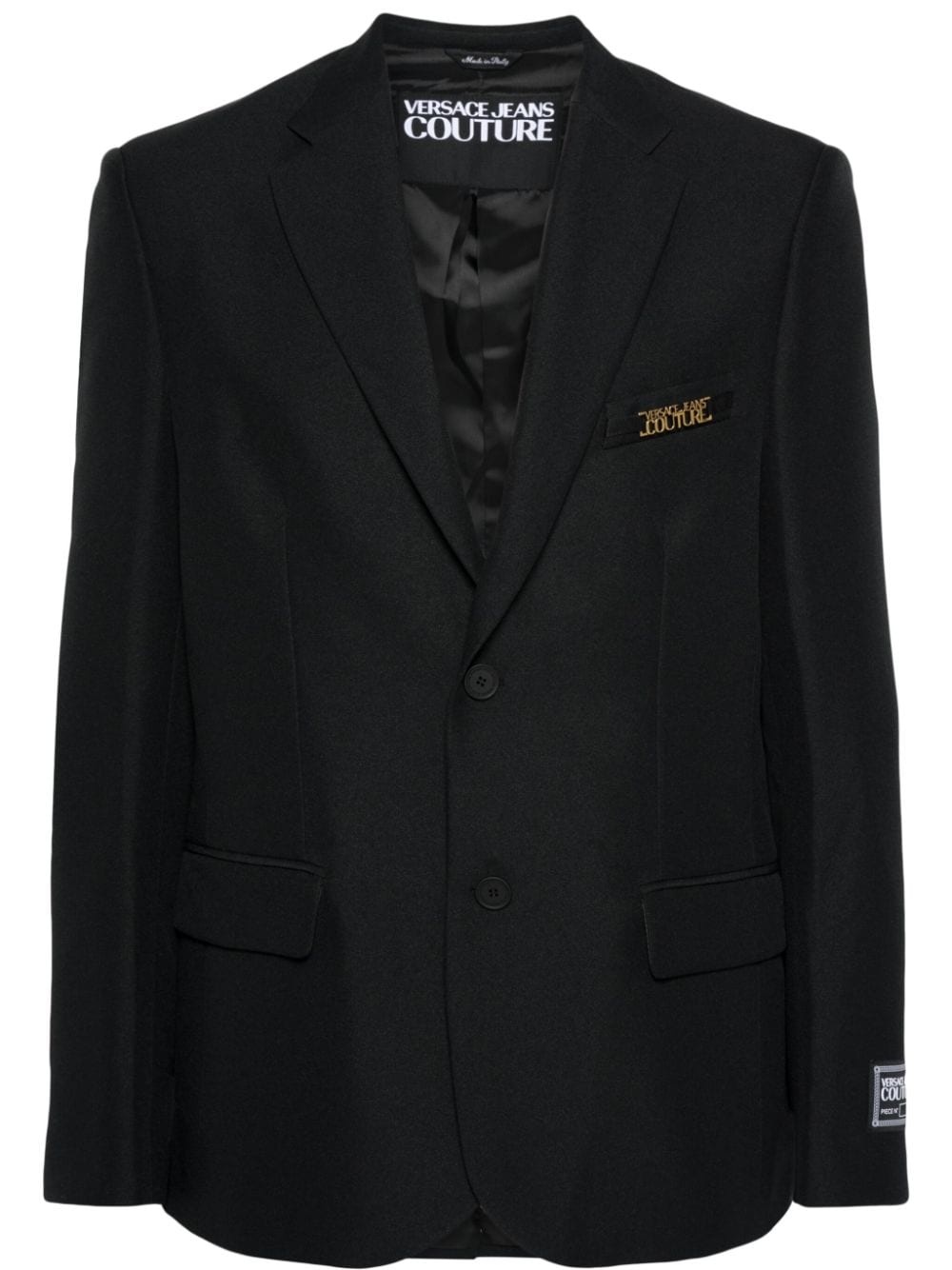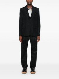 logo-applique blazer Highlights - Jet black - Gold-tone logo lettering - Applique logo - Notched lapels - Front button fastening - Long sleeves - Buttoned cuffs - Jetted chest pocket - Two front flap pockets - Straight hem - Full lining Made in Italy Composition Lining: Acetate 60%, Viscose 40% Outer: Polyester 100% SIZE & FIT Model measurements Height 6 ft 2 in(1.88 m) Bust/Chest 36.61 in(93 cm) Hips 35.82 in(91 cm) Waist 27.95 in(71 cm) FittingInformation Designed for a regular fit, allowing for a comfortably loose fit throughout the body The vented hem offers movement at the rear Made from a midweight non-stretch fabric This piece fits true to size – take your usual size