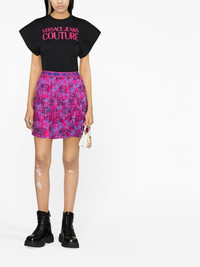 Logo Couture pleated miniskirt This miniskirt showcases a signature motif seen throughout Versace Jeans Couture's collections. It's patterned all over with a Logo Couture print - a contrast of gold Baroque-inspired acanthus leaves and monochrome brand lettering. Made in Italy Composition Polyester 100% SIZE & FIT Model measurements Height 5 ft 10 in(1.77 m) Bust/Chest 32.67 in(83 cm) Hips 35.43 in(90 cm) Waist 23.62 in(60 cm) FittingInformation This piece fits true to size. We recommend you get your regular size Designed for a loose fit with a close fit at the waist Made with a mid-weight non-stretch fabric Washing instructions Dry Clean Only