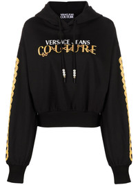 Logo Couture-print hoodie This hoodie by Versace Jeans Couture is crafted from cotton and elevated by the Logo Couture print. Notice the pearls at the drawstring for a modern look. Highlights - Black/white/ochre yellow - Cotton - Logo print at the chest - Logo print at the sleeve - Faux-pearl detailing - Drawstring hood - Long sleeves Imported Composition Cotton 100% SIZE & FIT Model measurements Height 5 ft 10 in(1.77 m) Bust/Chest 32.67 in(83 cm) Hips 35.43 in(90 cm) Waist 23.62 in(60 cm) FittingInformation Designed to be unstructured, offering a loose fit throughout Made from a midweight non-stretch fabric, this piece offers minimal elasticity when worn This piece fits true to size – take your usual size